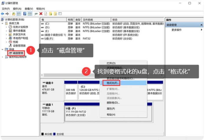 2、进入管理窗口后,点击【磁盘管理】;找到并右键单击需要进行格式化的u盘,点击【格式化】即可。