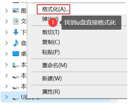 1、将u盘插入电脑usb接口,打开【我的电脑】或【文件资源管理器】,找到u盘所在的位置,右键点击u盘,选择【格式化】。