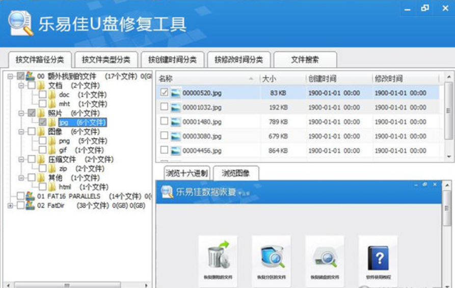 6、分类详细:乐易佳U盘修复工具在扫描完成后,会将找到的文件按照目录、文件类型、文件创建时间、文件修改时间等详细信息进行分类,方便用户查找和恢复丢失的数据。
