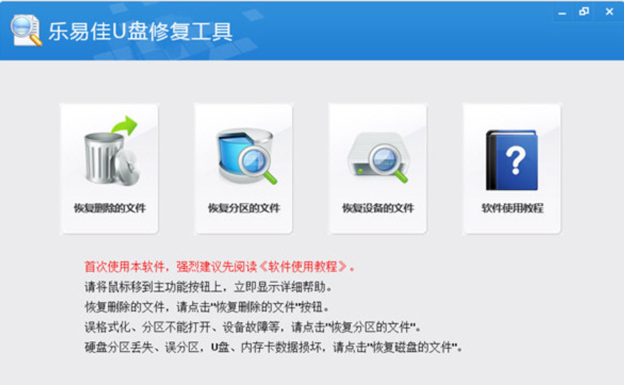 乐易佳U盘修复工具是一款专业修复U盘数据的软件,可以有效解决各种U盘发生故障而不能读取数据,或是人为操作失误及病毒侵袭造成U盘数据丢失问题。