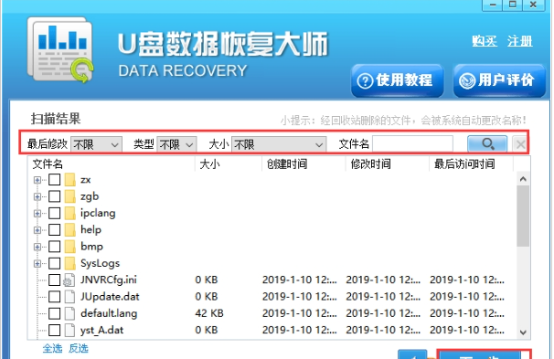 4、u盘数据恢复大师软件扫描完成后,我们就可以在界面中看到删除的文件了,我们选中自己要恢复的文件,然后点击下一步。