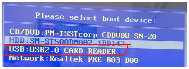 4、重启电脑,开机时快速按热键进入 Bios 或者快速引导菜单的界面,进入后使用方向键选择U盘选项。