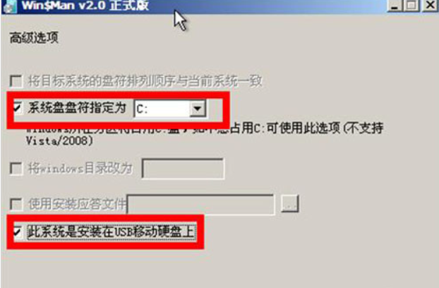 下面选择“系统盘盘符指定为”和“此系统是安装在usb移动硬盘上”单击“下一步”。