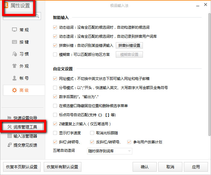 第四:手动造词和自定义短语:第一步:我们先打开“属性设置”,然后找到“词库管理工具”