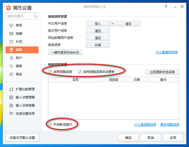 3、在属性设置中选中【词库】——取消【开启新词提醒】【启用细胞词库自动更新】——【确定】;词库更新让可以通过设置实现后台自动更新,没必要开启提醒这样只会增加弹窗;