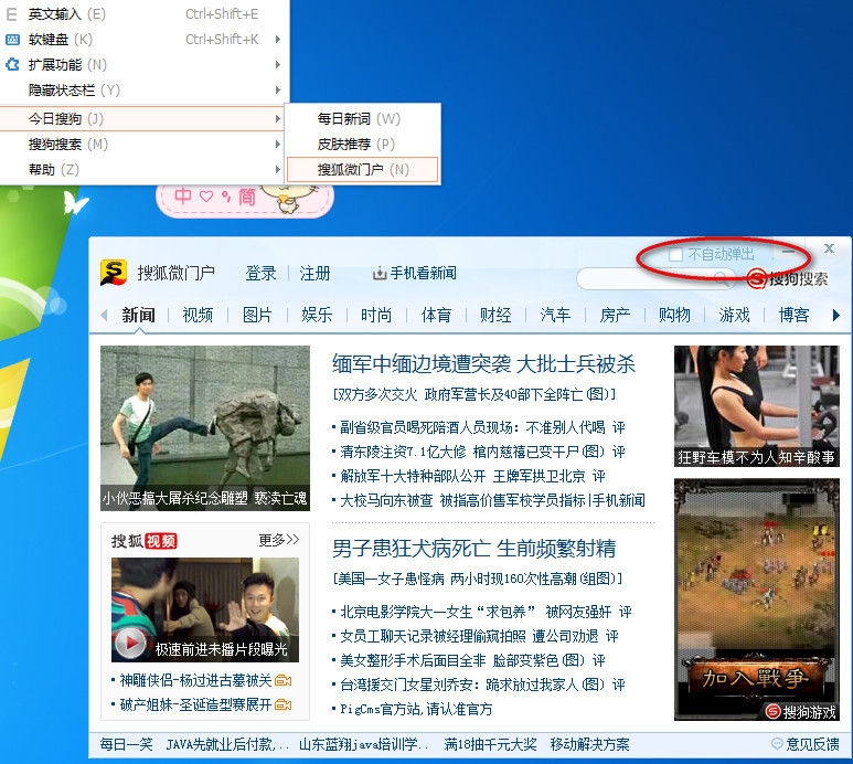 7、选中【今日搜狗】——搜狐微门户——选中不在自动弹出!
