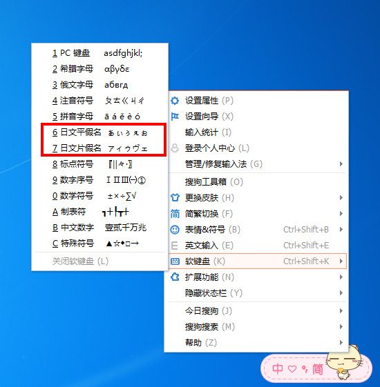 1、右击搜狗输入法,点击软键盘,在软件盘选项中有“日文平假名”和“日文片假名”