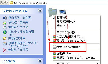 打开光速的默认安装路径【C:\Program Files\Gsoft】,找到【gswb】文件夹,在文件夹上右键选择【使用360强力删除】