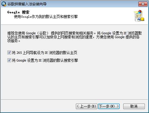 全新推出的谷歌拼音安装是非常方便的,用户基本上一路单击"下一步"按钮即可快速进行安装了,在安装结束时,谷歌拼音还会有"将谷歌拼音输入法设为默认的输入法"的选项提示,用户可以随手设定。另外,在笔者意料之中的是,该谷歌拼音集成了"Google工具栏"的安装文件,不过好在它不是强制安装,用户可以通过选择定制来取消它的安装。