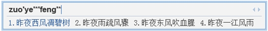 输入时,可用*号代替部分拼音串,很方便的输入含有生僻字的词,或者诗句等,*号代表一个或多个汉字。