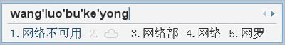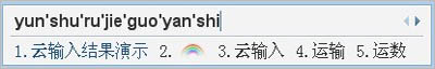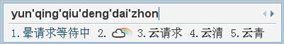 输入的过程中会根据系统判定是否需要进行云请求,云输入的结果会展示在候选框的第二位。云请求发起后,开始数据请求,请求中会显示一朵飘着彩虹的云。(QQ拼音4.0版本提供的云输入功能是默认打开设置)效果如下图: