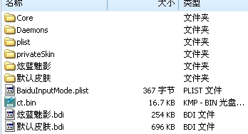 2、用iTools(我习惯)或者同步助手等同类软件打开var/mobile/Library/Keyboard/BaiduInputMethod/,可以看到两个bdi文件和同名文件夹(默认皮肤、炫蓝魅影),实际修改时可以只修改文件夹内文件,bdi文件可以用winrar打开,包含文件和文件夹内一致,是什么关系我现在还没搞明白。