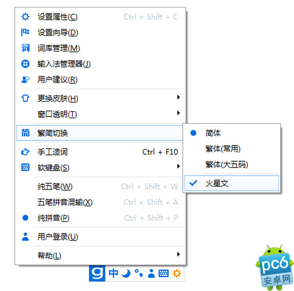 随着互联网的高度普及,火星文随着网游等渠道进入大陆,且受到越来越多年轻用户的追捧,为了打出火星文,他们将汉字输入到特定的火星文转换器中来实现输入,这其实非常不方便。为了满足这批年轻用户的需求,光速输入法将火星文输入功能也集成到软件中,右击输入法状态栏,选择繁简切换,再选择火星文输入即可完成设置。