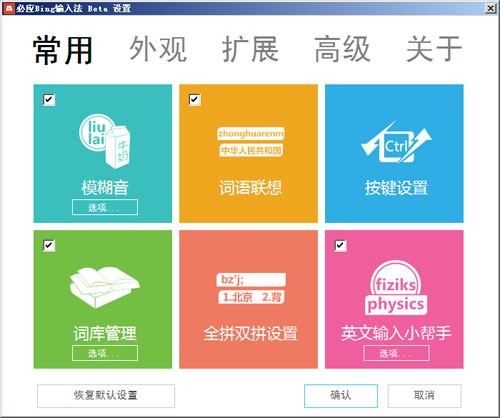 扩展下载,目前扩展有限,只有一个应用字符和应用编辑器下载;多媒体输入,这个在某种程度上是Bing拼音输入法借助Bing搜索引擎的优势,但是Bing在国内的市场份额少得可怜,个人蛮喜欢这个功能;自动升级功能,是输入法都应该支持;其他一些笔者未挖掘的功能。