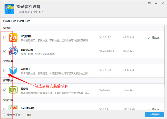 蓝光装机必备可以让大家挑选需要的软件,一键快速安装到电脑。使用蓝光软件工厂制作到U盘中,随身携带,随时赚蓝光币。下面是蓝光装机必备的使用指南。