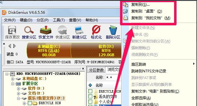 5、使用diskgenius查找出误删除的文件后我们可以选择需要恢复的文件,然后右键单击复制到指定位置就可以了