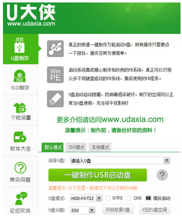 时下,使用U盘装系统已经是一种主流的装机方式。用U盘装系统要比传统的光盘装系统更加的方便、简单,也是众多装机人士的首选。用U盘装系统有个前提,就是需要把U盘做成u盘启动盘才能够安装系统。这里小编向大家推荐一款[U大侠U盘启动制作工具],用U大侠实现一键制作U盘启动盘,一键装机,短短几分钟搞定系统的安装。