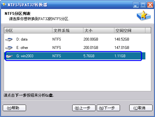 3、在NTFS分区列表中选择一个您想转换到FAT32的NTFS分区,这里我们选中G盘,然后点击“下一步”或“Next”按钮:(注意:这个程序不能直接转换系统分区C盘)