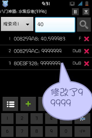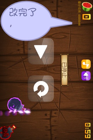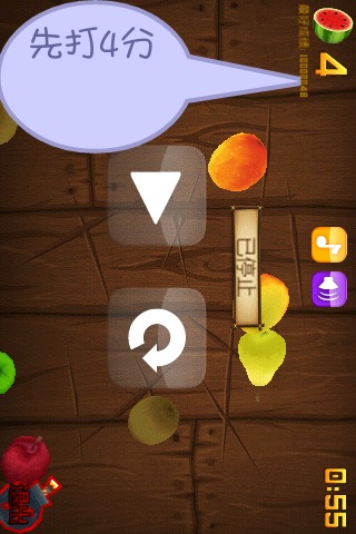1.进水果忍者,随便进个模式,先打4分,暂停(如图1),打开八门神器,你会看到(图2)这个界面,我加上了解释,大家看图;
