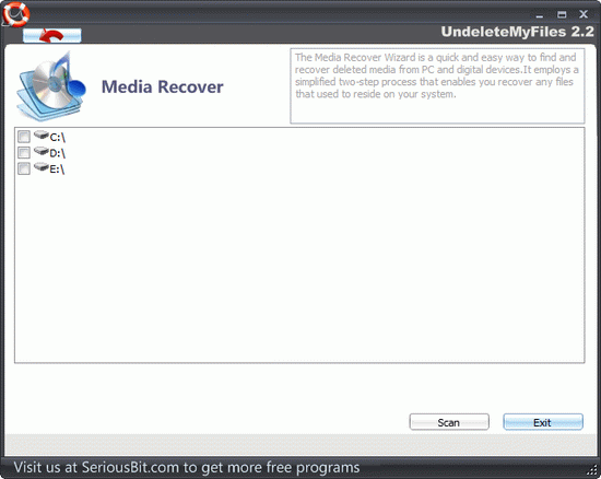 UndeleteMyFiles是一款专业的数据恢复工具,支持恢复硬盘、USB闪存设备、CF卡、SD卡等存储设备上的数据,同时它也提供了专业的文件清除工具,让你彻底干净的删除文件。最重要的一点是,相对其他同类软件来说,它是少有的免费恢复工具。