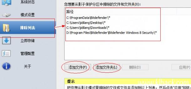 例如,我希望桌面能继续保存文件,那么我就点击“添加文件夹”把“桌面”或者Downloads等目录添加到“排除列表”,把杀毒软件安装目录及数据文件夹内的相关内容进行排除,这样即使我重启电脑,桌面上的文件仍会完好无损。