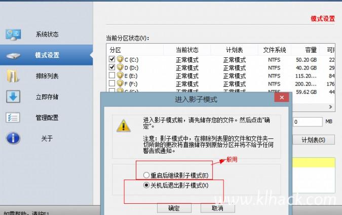 例如我希望C盘一直处于影子保护下,以后再开机也一直这样,那么我最好选择第一个模式,点“确定”。这样每次开机都不用重新设置。