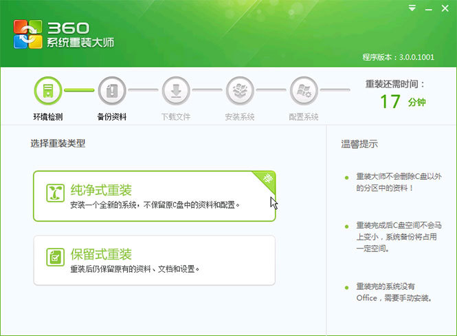 选择纯净式重装或者在保留式重装中选择完要备份的资料后,点击下一步,重装过程正式开始。