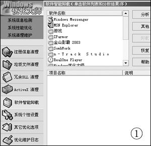 1、打开“优化大师”,进入“系统清理维护”类别中的“软件智能卸载”页面。在页面上方的程序列表中提供了Windows“开始/程序”菜单中全部的应用程序列表,在列表中选择要分析的应用程序(如图1)(如果要分析的程序没有出现在列表中,点击“其他”按钮,手动选择要分析的程序)。