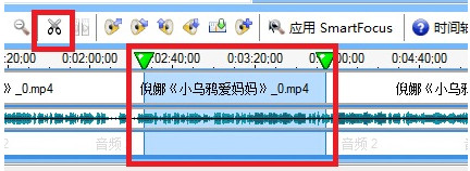 5、由于这里的视频是含有音频的,导入的视频不包含音频,可以自己添加音频文件,音频文件同样使用拖拽的方法,但是要拖拽到视频下方的音频轨道上。如果觉得视频哪里不需要,需要剪掉,可以先在轨道上选择区间,随后点击工具栏上的小剪刀即可