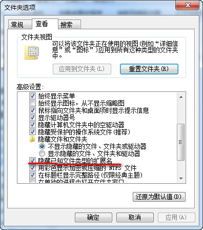 2、在“文件夹选项”对话框中选择“查看”选项卡去掉“隐藏已知文件扩展名”的勾勾