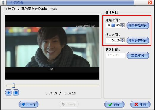 步骤三:在文件列表中,选中需要截取片段的视频,点击窗口右边的“分割设置”按钮,进入“分割设置”窗口,可以直接修改开始时间和结束时间,也可以播放预览到需要截取的部分,点击“设置开始时间”按钮来读取当前预览时间作为开始时间。点击“上一个”、“下一个”可以对所有添加进去的视频依次设置,设置好后点击确定按钮即可;