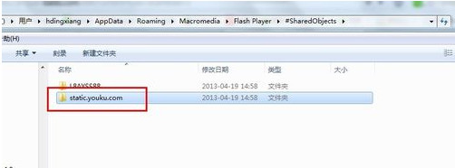 第四步:找到static.youku.com文件夹,这个文件夹在Windows 7中的位置是在C:\用户\你的当前用户\AppData\Roaming\Macromedia\Flash Player\#SharedObjects ,Windows XP中的位置在 C:\Documents and setting\你的当前用户\ApplicationData\Macromedia\Flash Player\#SharedObjects\DXGB5Y7G