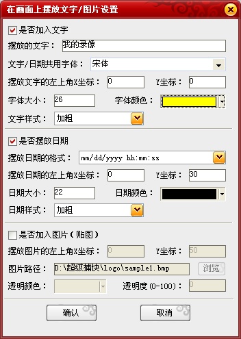 除了录制摄像头视频,我们还可以为视频添加水印、文字、录像日期等。点击“DV/DC/TV/摄像头捕捉”选项卡下方的“设置文字/贴图”按钮,在在弹出的对话框中即可设置。你可以为录制的视频打上自己的LOGO!