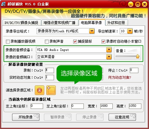 使用橙色录像区域选择工具,帮助我们准确的选择录像区域。软件支持边录视频,边录声音。如下图所示,在“录像的音频设备”处选择声卡名称,在“录像的音频端口”处选择正确的音频端口即可。建议安装声卡最新官方驱动,让声卡的性能更大的发挥出来。