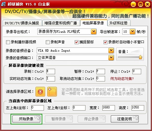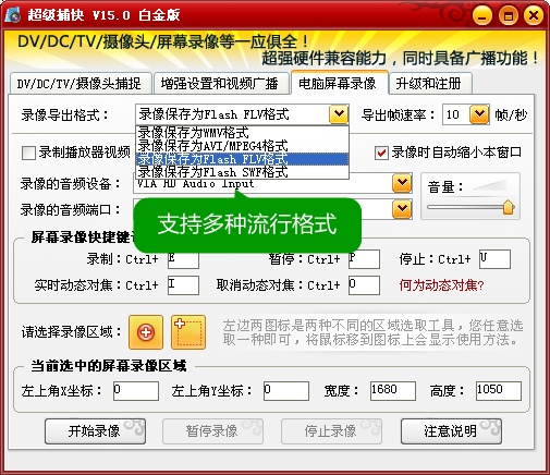 接着就来介绍“电脑屏幕录像”功能。使用这个功能,我们就可以录制电脑屏幕画面、播放器视频、网页视频、聊天视频、游戏视频……在“录像导出格式”处,我们可以导出AVI,FLV,WMV,SWF等流行的格式,视频的清晰度和体积可由你自由设置,软件支持导出高清的视频。