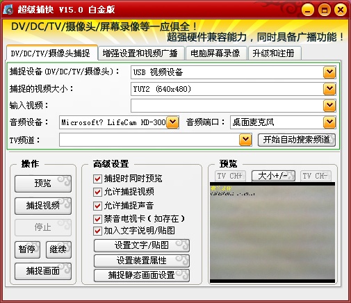 如下图所示,超级捕快支持录制摄像头、数码摄像机、电视卡等的视频。通过点击“DV/DC/TV/摄像头捕捉”选项卡即可实现。譬如,你可以将自己弹吉他,演奏古筝等通过摄像头捕捉功能,录制下来,上传到网上和网友们分享的。