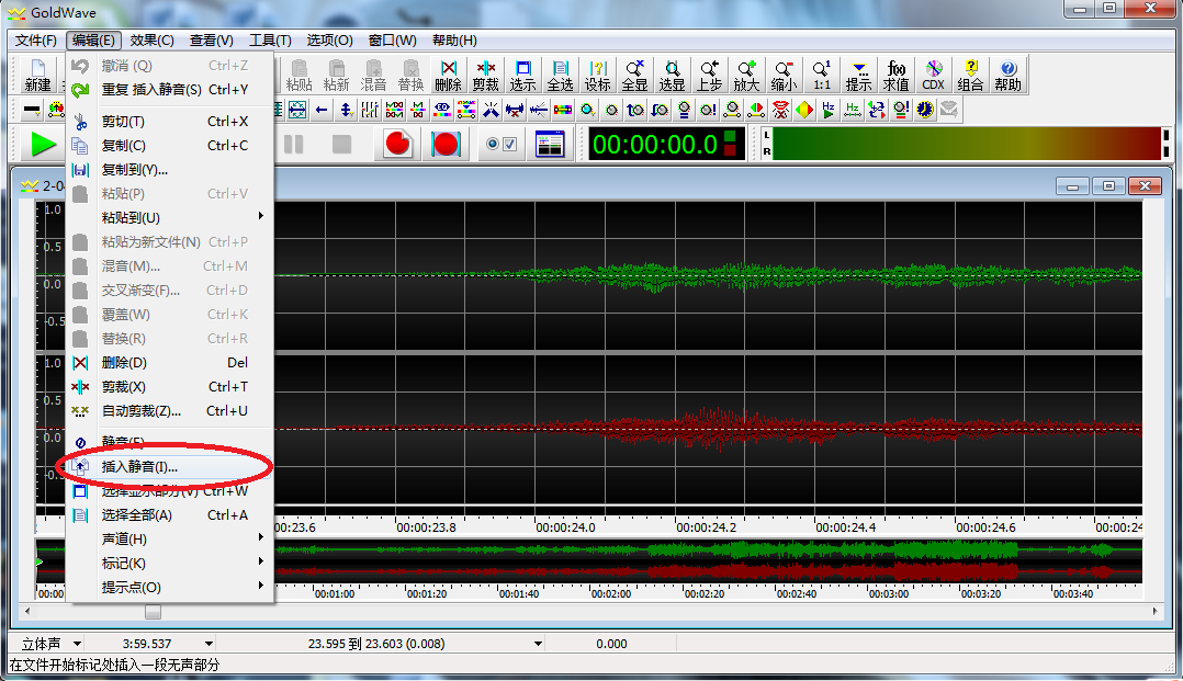 如果想在一个地方插入静音,就把这放得很大很大,然后圈一个小框,点编辑-插入静音就行啦~如图9所示。如果是想把框住的音频直接给静音,就选择编辑-静音就行啦,就在插入静音的上边~~~
