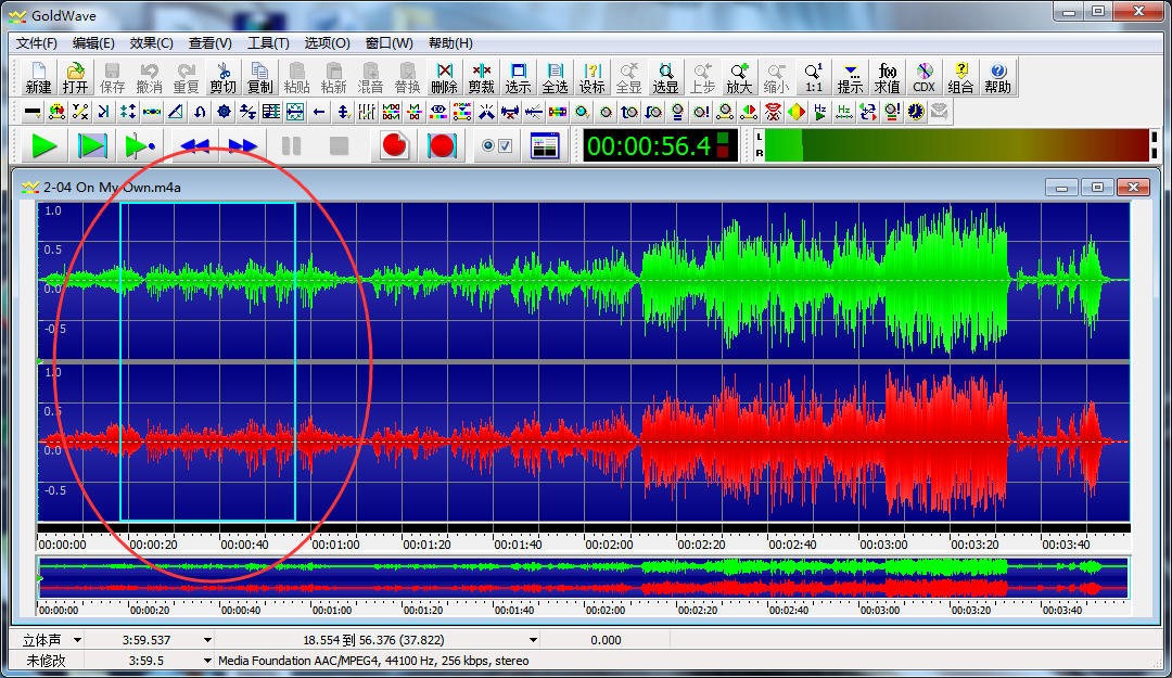 先说一下基本操作。这些键位都可以再选项-键盘里面设置。给大家说几个简单常用的。空格键是开始暂停,H键是播放你鼠标指的地方(英文输入法的时候有效,无效的时候切换下输入法吧~),ctrl+c复制,ctrl+v粘贴,ctrl+x剪切,这些跟windows是一致哒~~~很方便哒~~~鼠标单点击其实是选框,也就是选取了一片区域,不过单击是选择了从单击点到文件最后的区域,拉动鼠标进行选框的时候,如图6就是选框框住这一部分了。