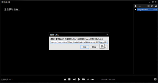 添加磁力链接之后,左上角就会有“正在获取信息”字样,依照资源速度和带宽,决定你的播放速度