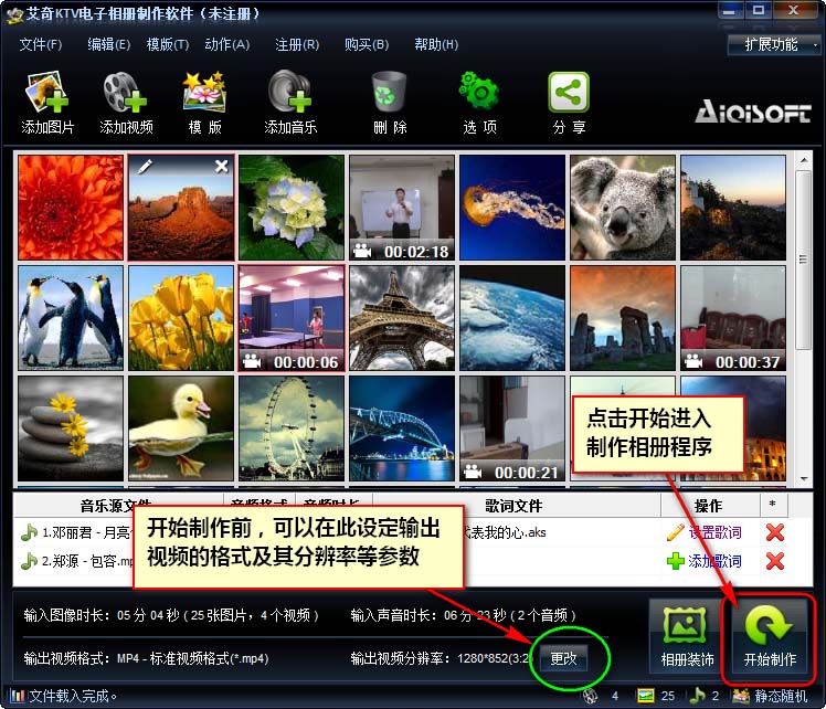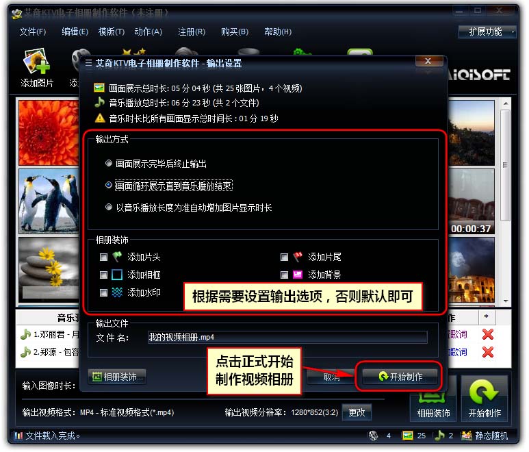第四步:开始制作输出视频电子相册,根据自己的需要,选择一个视频输出格式,否则默认即可。点击“开始制作”按钮开始制作电子相册。