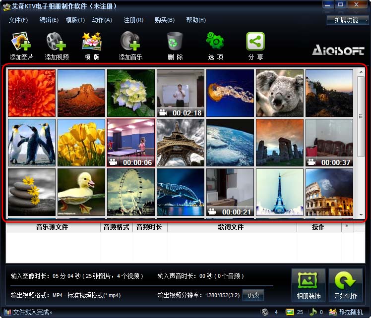 艾奇ktv电子相册制作软件教程是pc6的小伙伴通过帮助文档和自己亲自动手实践整理给大家的,艾奇KTV电子相册制作是一款功能超强的电子相册和卡拉OK视频制作软件。可以把您的照片和视频配上音乐和歌词字幕,制作成各种格式的视频电子相册。让你的电子相册或者卡拉OK视频更具有别具一格的风格,那怎么制作呢?看看方法吧!按照这个步骤一定可以制作非常精美的电子相册!