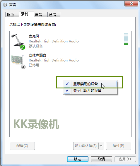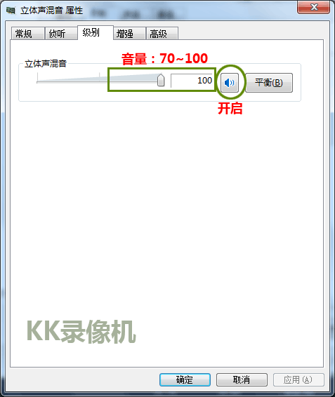 KK录像机开始录制后,声音波形条上下波动,说明有录到声音;波动越大,音量越大。如果没有波动,则没有声音,需要修改录音选项。