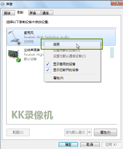 第三步:右键点击‘麦克风’-‘启用’。再右键点击‘立体声混音’,-‘设置为默认设备’。