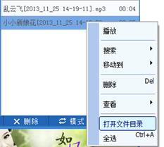 结束录音操作;录制好的录音文件(MP3格式)自动存放在“我的录音”列表中,在文件名上点击右键弹出菜单可以打开录音文件所在磁盘目录。