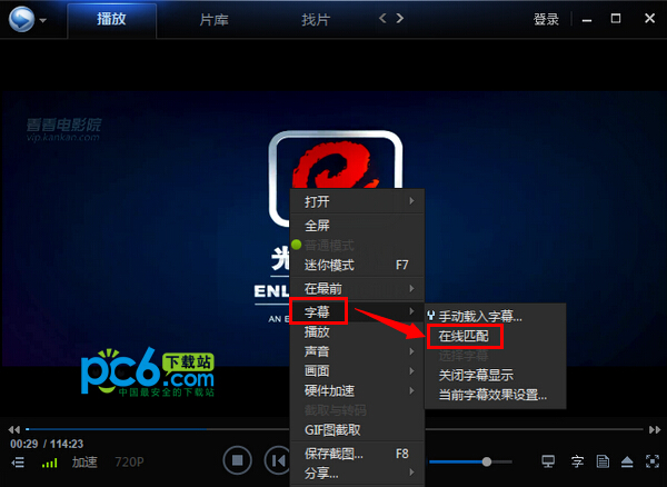 在播放界面点击右键,选择“字幕”-“在线匹配”,之后屏幕左上角会出现“匹配成功,加载在线字幕”。