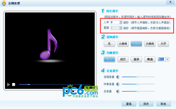 在录制完成后期处理的时候有调节自唱速度以及画面播放速度的功能,您先停止试听的歌曲,然后在调节框内填入需要修正的时间,最大可调节±3000毫秒。