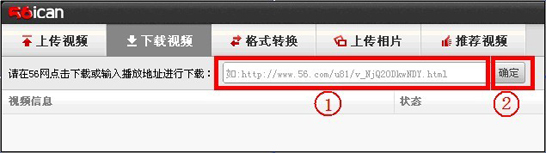 下载方式一:将56视频播放地址(例如:http://www.56.com/u31/v_NjYxMTYxODA.html)复制到iCan的下载框中 ① 点击确定 ② 。
