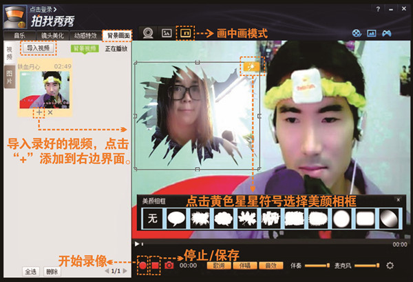 第2步:如图2,选择拍我秀秀的【画中画模式】,点击【背景画面】的【视频】,导入刚才录好的视频,点击“+”将视频添加到右边界面,将会看到双人画面,点击相框右上角的星星符号,选择喜欢的美颜相框特效,还可以拖动相框的边框调整相框大小和位置。