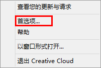 你也可以在进入Adobe Creative Cloud主界面后,点击右上角的设置按钮图标,然后选择“首选项”,其他操作与方法一一致。