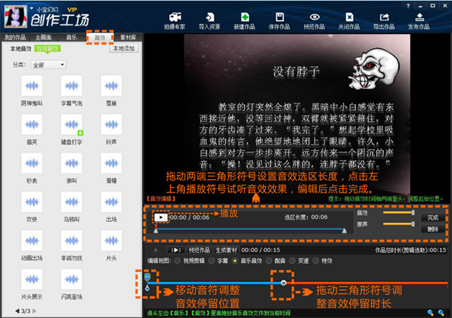 第2步:如下图2,添加音效后,在音效编辑区域可以对音效进行编辑,拖动两端三角形符号设置音效选区长度,点击左上角的播放符号试听效果,编辑完成点击【完成】。拖动编辑轨道上的音符可调整音效在视频上的停留位置,拖动三角形符号可调整音效停留时长。